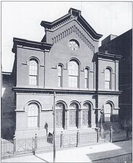 This building remained for some 30 years before the congregation, swelled by waves of immigrants in the 1840s and 1850s, required larger quarters. Several sites were considered for the new synagogue building, and finally a property was purchased at 117 N. 7th Street in 1858 for $15,100. The cornerstone was laid on May 9, 1859. This third building was designed by John McArthur, who later designed Philadelphia’s City Hall, the tallest and largest building in America at the time. An elaborate dedication ceremony was held on May 24, 1860, with Rev. Dr. Sabato Morais officiating. Instrumental music was furnished by an orchestra, and the vocal selections were arranged by Dr. Morais, based on melodies from the Spanish and Portuguese Congregation of Livorno, Italy. Though the McArthur building lacked the charm of the Strickland synagogue, and did not display any of the more elaborate style of the City Hall building he designed a decade later, it was still a handsome structure of brick and stone with an attractive interior. The sanctuary was situated on the second floor, with galleries above. The first floor was used for school meetings, lectures, committee meetings, and administrative offices. In the rear of the building, was a small house used for the Sexton’s quarters.